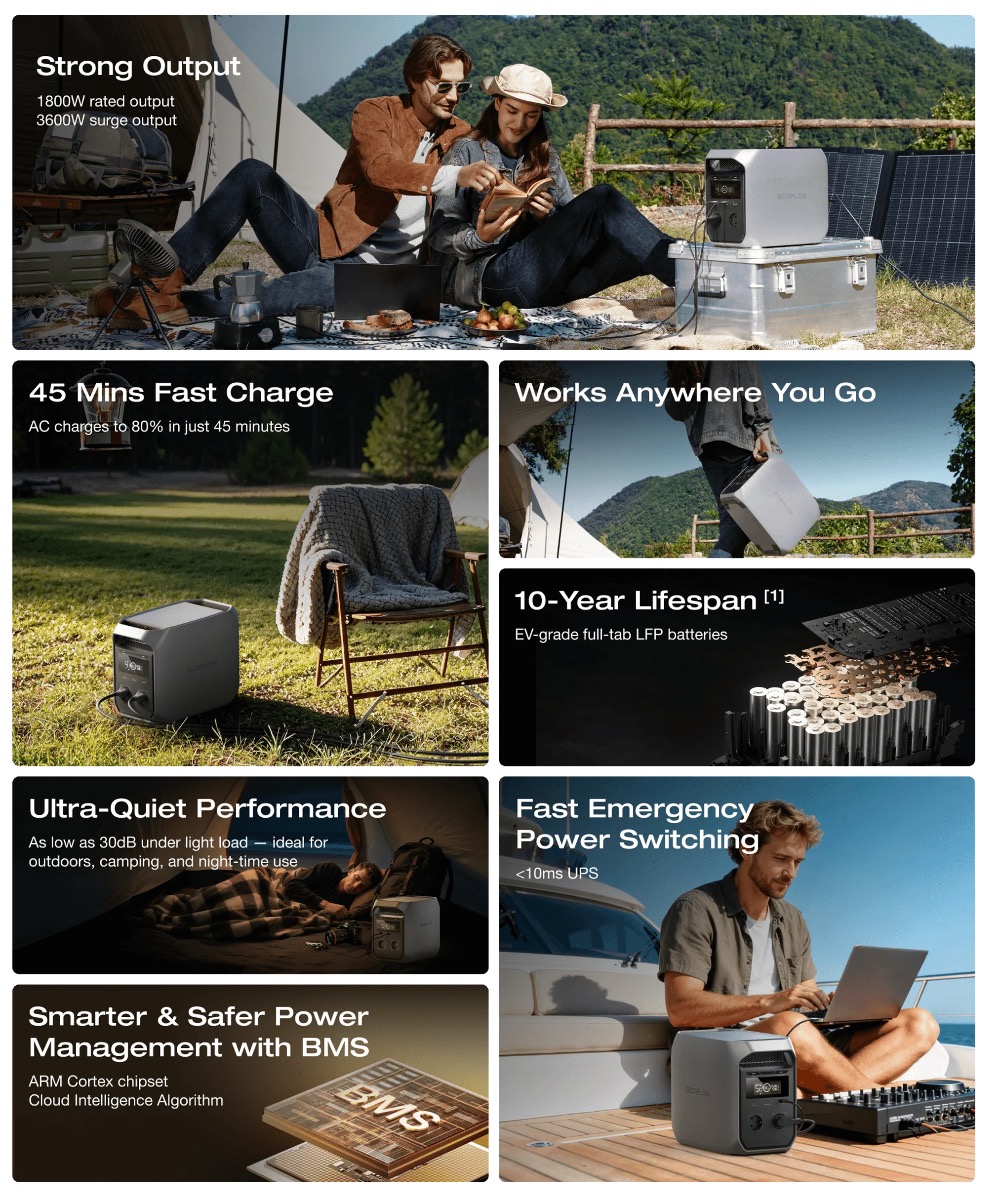 With a 1800W pure sine wave constant output (3600W surge) and X-Boost technology up to 2400W, it can safely power everything from sensitive electronics to high-energy equipment. The UPS <10ms function makes it ideal for protection against power outages.
