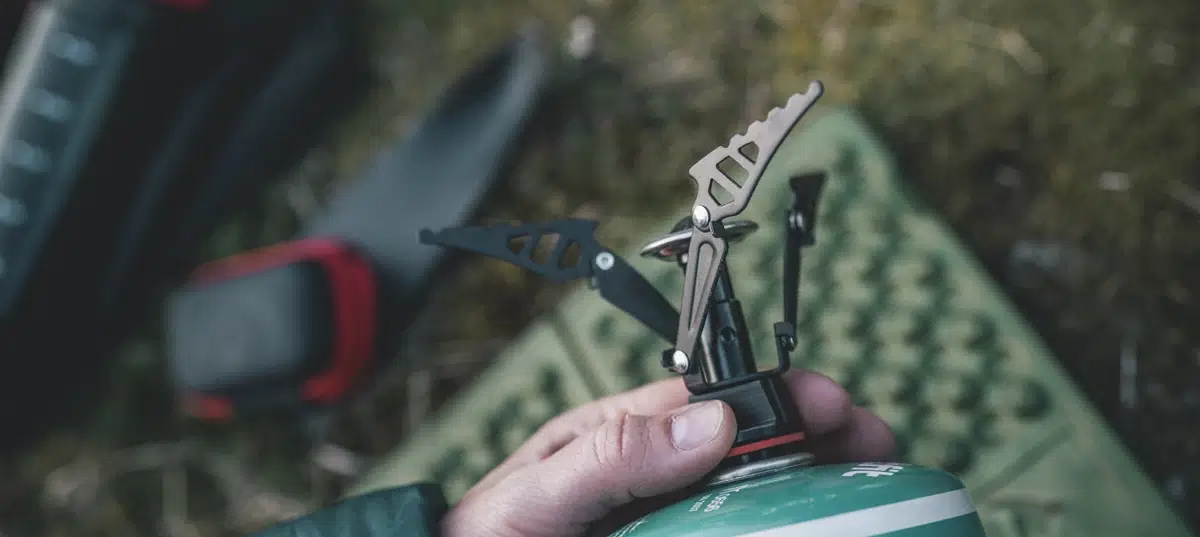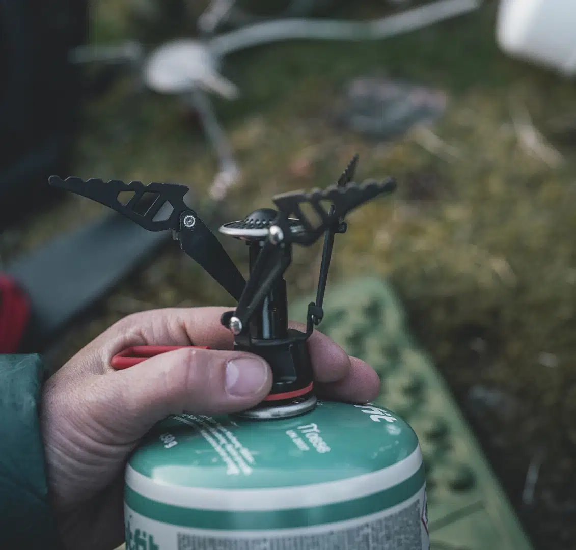 It screws directly onto EN417 gas cartridges, ensuring quick and hassle-free setup. The flip-out pot supports provide a stable cooking platform, while its compact size makes it perfect for minimalist backpacking.
