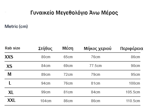 Rab Γυναικείο Μεγεθολόγιο Άνω Μέρος
