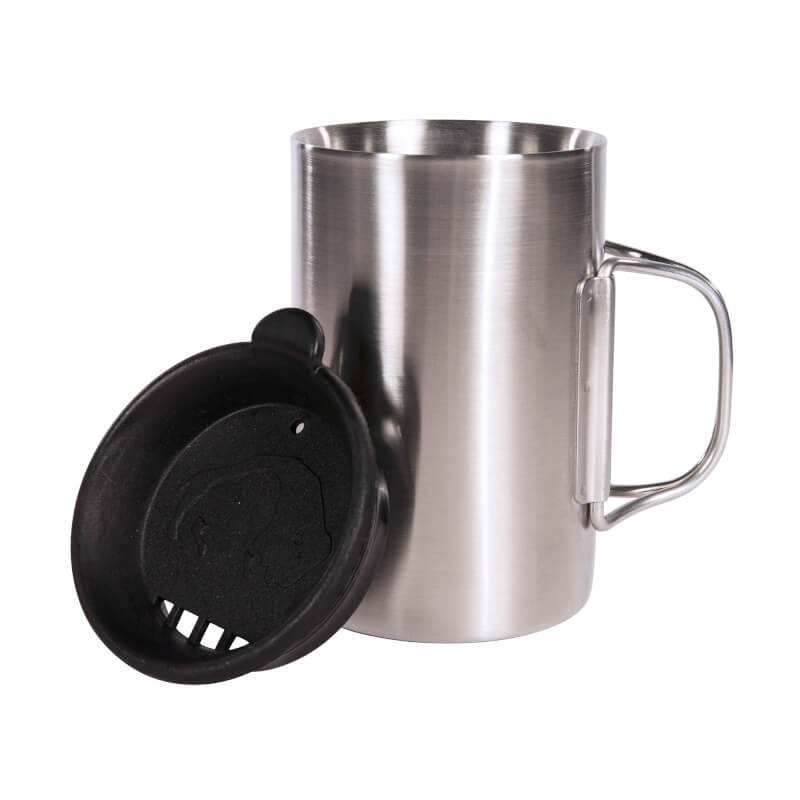 It features a foldable handle for easy storage and portability, while the internal measuring scale allows for precise use. The included lid enhances insulation and protects your drink on the go.