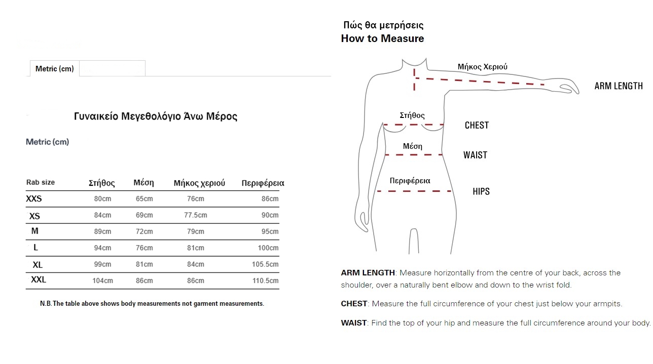 Rab Γυναικείο Μεγεθολόγιο Άνω Μέρος