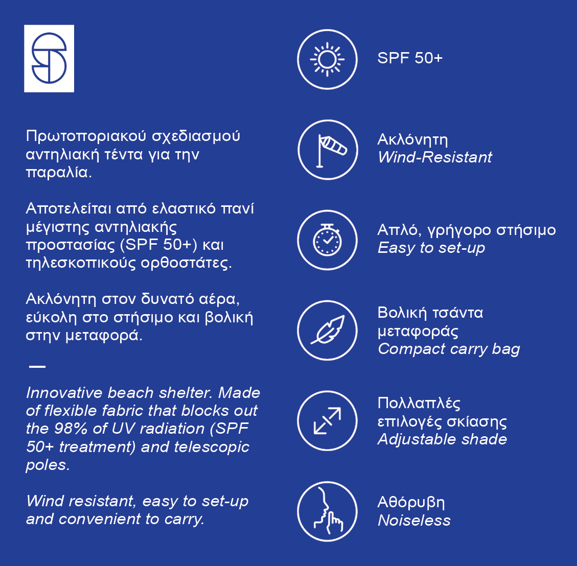 Η Salty Tribe Aeolians είναι η αντηλιακή τέντα παραλίας νέας γενιάς, σχεδιασμένη για τις απαιτητικές ελληνικές παραλίες με έντονο ήλιο και δυνατό αέρα. Χωρίς βαριά μεταλλικά πλαίσια και χωρίς κουραστικό στήσιμο, προσφέρει κορυφαία σκίαση, σταθερότητα και ευκολία μεταφοράς. Το ελαστικό ύφασμα Microfiber Lycra με προστασία SPF50+ μπλοκάρει έως και 98% της υπεριώδους ακτινοβολίας, ενώ η ελαστικότητά του απορροφά την πίεση του αέρα, διατηρώντας την τέντα σταθερή και αθόρυβη. Ιδανική για οικογένειες, ζευγάρια και παρέες που θέλουν άνεση και σιγουριά στην παραλία.