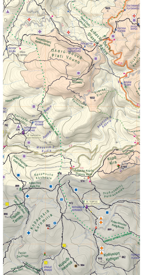 Περιλαμβάνει καταφύγια, πηγές, κορυφές και βασικές πεζοπορικές διαδρομές